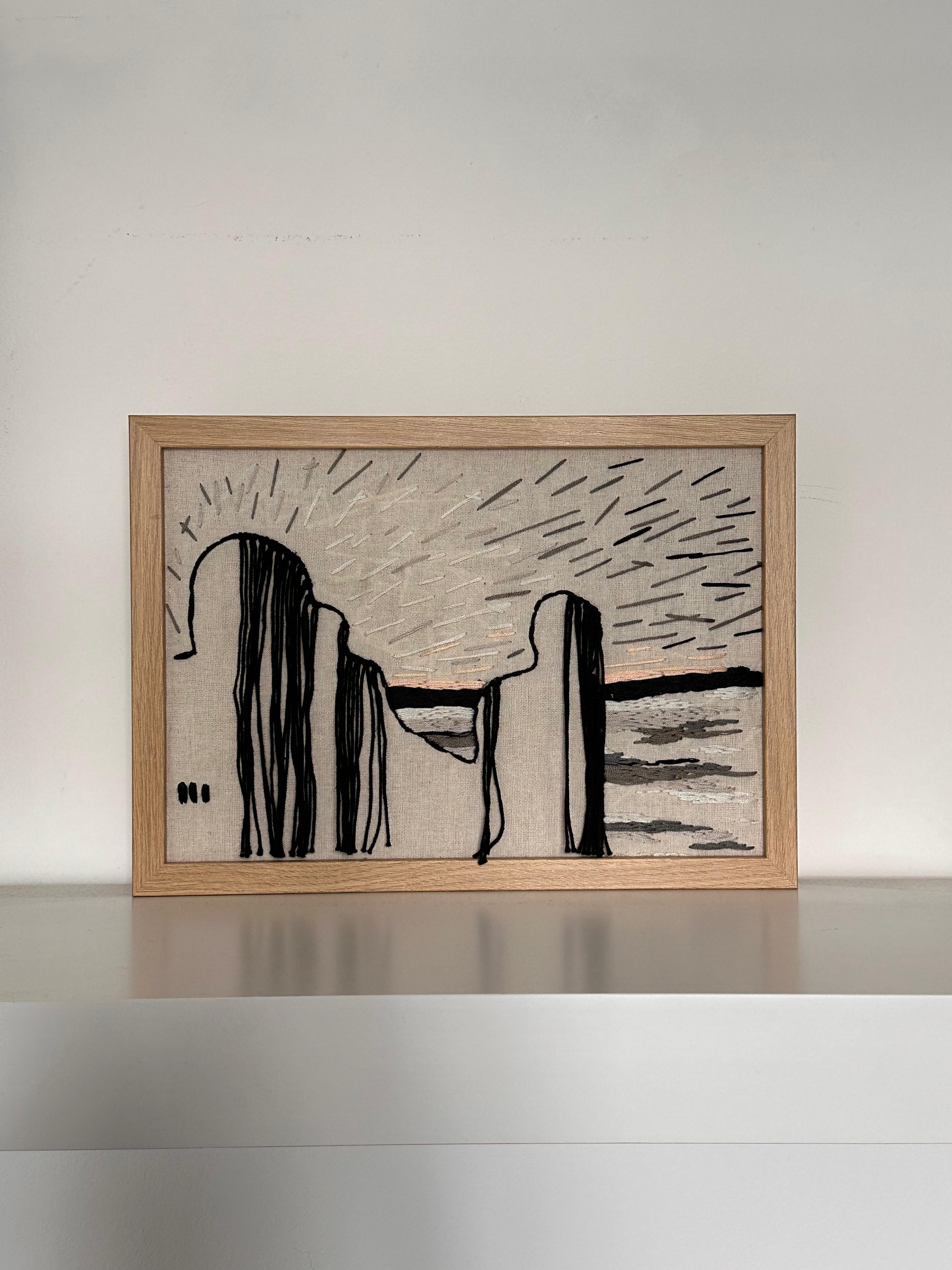Through hand stitching, we translate landscapes and emotional moments into textile works, sometimes wearable, sometimes conceived as independent pieces.